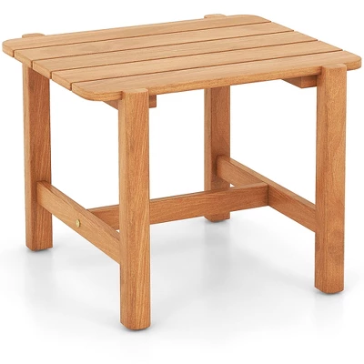 Enhance your outdoor relaxation area with this side table.Constructed from natural teak wood, this end table promises enduring performance and high strength. For higher stability, the patio snack table is supported by cross-shaped structure and equipped with protective food pads. Featuring a beautifully designed slatted tabletop, this outdoor side table not only offers a stylish aesthetic but also promotes quick drying. Whether you are enjoying a morning coffee, an afternoon read, or an evening refreshment, this patio teak wood side table serves as a convenient and stylish surface.