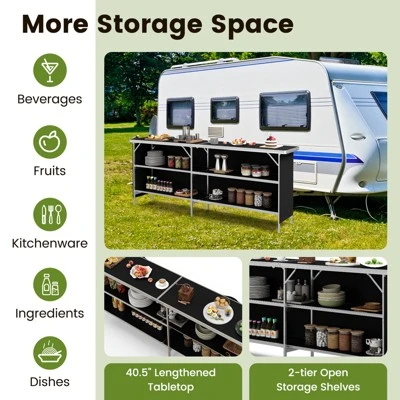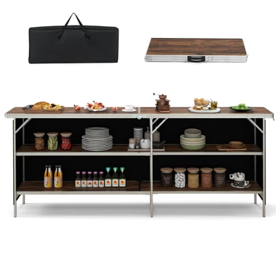- Large Storage Space: The 2-tier shelf offers ample storage space for all your needs such as wines, beverages, snacks, fruits, tableware, and cooking meals. Meanwhile, the 81″ long tabletop allows you to neatly organize everything. The tabletop can hold up to 132 lbs, and each shelf can hold up to 33 lbs.