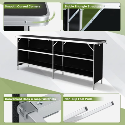 This camping table is a must-have for outdoor enthusiasts. It features a large 81-inch tabletop and 2-tier shelf, which offers ample storage space for wines, beverages, snacks, fruits, tableware, and cooking meals. Its sturdy aluminum alloy frame is rustproof and lightweight. The stable triangular structure ensures exceptional stability on any terrain. The detachable side screen made of 600D Oxford fabric provides privacy and protects your belongings from sunlight, with easy attachment using the hook and loop fastener. The foldable design and dual handles make it easy to carry and transport, and it comes with a carrying bag for convenient storage. Hence, this ideal for camping, picnics, barbecues, and more.