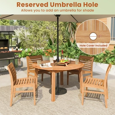 Discover the charm of outdoor dining with our 53″round patio dining table, designed to host 4-6 people comfortably. Ideal for various outdoor settings like patios, gardens, yards, or next to the pool, this table becomes the center of family gatherings and casual get-togethers. Crafted from premium oil-treated acacia wood, it ensures durability and robustness, while the slatted tabletop design prevents water accumulation and makes maintenance a breeze. The reinforced bottom structure and robust support legs also enhance overall strength and provide superior stability. Additionally, an integrated umbrella hole offers the option to add shade on sunny days, enhancing your outdoor dining experience.