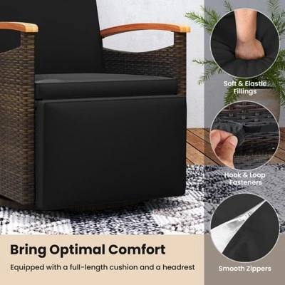 Enhance your outdoor relaxation experience with our premium swivel wicker recliner chair! Designed for personalized comfort and convenience, this outdoor recliner features a side table, making it a perfect seating choice for your patio, backyard, poolside, or porch. The adjustable backrest and footrest allow you to find the perfect angle for maximum relaxation, while the soft pillow and cushions provide added comfort. The acacia wood armrests offer both support and style. Crafted from hand-woven PE rattan, this patio reclining chair is not only sturdy but also boasts anti-fading and sun-protective qualities. The 360 degree swivel base enables easy socialization with friends or immersion in your surroundings.