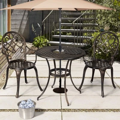 To beautify your garden, patio, balcony or poolside, just choose our Set of 3 Patio Cast Aluminum Dining Table Chairs Set with Ice Bucket! This set made of aluminum & iron material,features cast aluminum construction to deliver durability and light weight,and the antique finish adds an attractive look to your patio or deck. This table includes an ice bucket to keep your drinks cool on hot summer days. This Table features an ice bucket in center, diameter 9.5 inch, ice Bucket Capacity 5L, enjoy a perfectly chilled bottle of your favorite soda or other drinks, keep your drinks cool on hot summer days. Do not hesitate to buy it now!