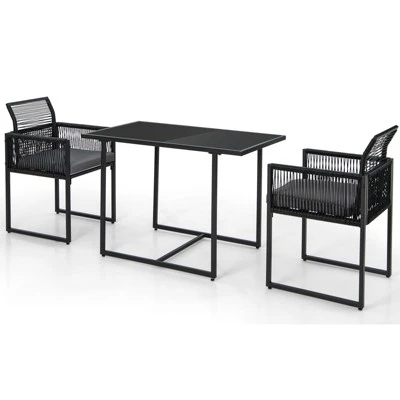 - Transform your outdoor living space with our exquisite 3-piece patio dining set, designed for those who cherish both comfort and elegance. Each chair is meticulously crafted with a contoured backrest that embraces your body, ensuring a cozy sitting experience that lasts for hours. The seat cushions, filled with high-density elastic foam, cradle you in optimal comfort with the added convenience of removable covers featuring zippers for hassle-free cleaning.