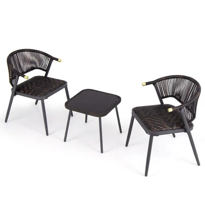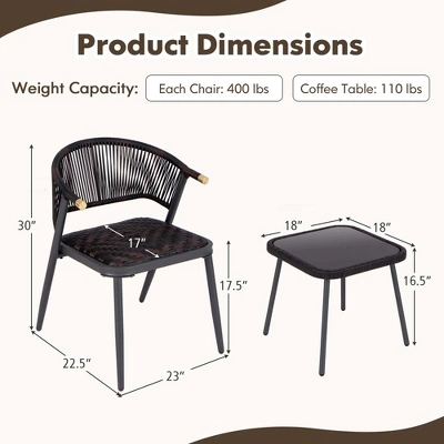 Elevate any outdoor space into a tranquil oasis with our 3-piece patio rattan furniture set that effortlessly combines comfort, style, and functionality. This set includes two cozy chairs featuring high-resilience quick-dry foam and a chic coffee table with a secure tempered glass top. Crafted from attractive PE rattan and sturdy metal construction, the chairs and coffee table exude elegance and promise long-lasting durability. The ergonomic backrest with stylish woven PU ropes adds an extra touch of coziness to the set. Perfect for balconies, backyards, or poolside areas, this patio conversation set is ideal for enjoying leisurely afternoons or peaceful evenings in supreme comfort and style.