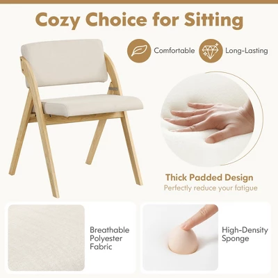 The dining chair set provides a cozy choice for sitting. The soft polyester fabric and elastic sponge fill of the thickly padded backrests and seats feel comfortable and are long-lasting for a long-term use. The kitchen chairs boast sturdy rubber wood legs that offer stability and elegance, supporting up to 355 lbs. Perfect for small spaces, these foldable chairs can be used in various settings beyond the dining room. No assembly required – simply unfold and enjoy a quick and convenient upgrade to your dining space.